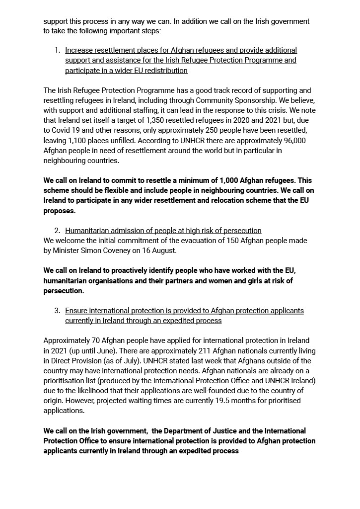 - Ensure Afghan people have access to the international protection process in Ireland
