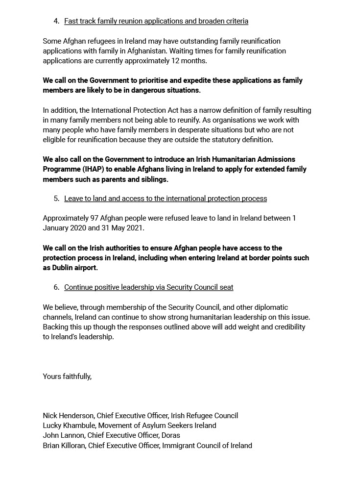 Welcoming the initial commitment to offer 150 people humanitarian admission to Ireland, plus commitments to prioritise family reunification the letter recommended other important actions. These include: