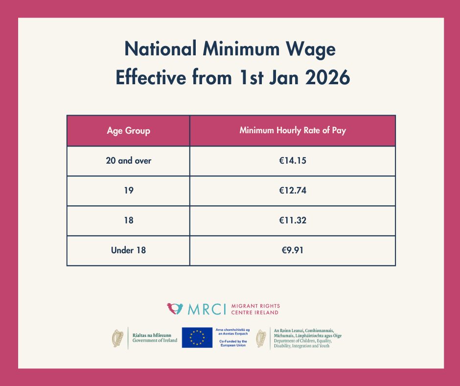 Since 1st of January 2026 the national minimum hourly rate is €14.15 per hour.